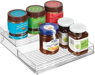 mDesign プラスチックキッチン食品ストレージオーガナイザーシェルフ スパイスラックホルダー キャビネット 食器棚 カウンタートップ パントリー用 瓶 ベーキング用品 缶詰 パスタ 2段階 幅10インチ 4パック クリア