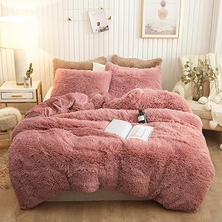 XeGe 豪華なシャギー羽毛布団カバーセット 高級ウルトラソフトクリスタルベルベット寝具3点セット (フェイクファー掛け布団カバー1枚+フェイクファー枕カバー2枚) ジッパー開閉 (クイーン、オールドピンク)
